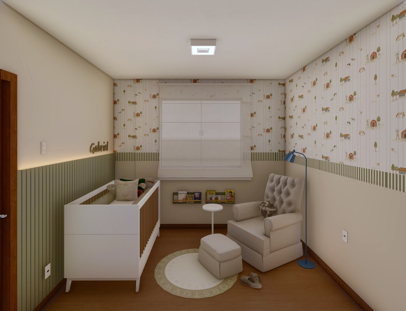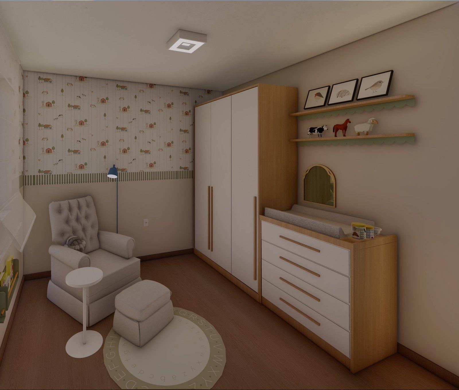 O projeto foi desenvolvido para uma mamãe apaixonada por animais, que desejava um ambiente simples, delicado e cheio de aconchego para o bebê.