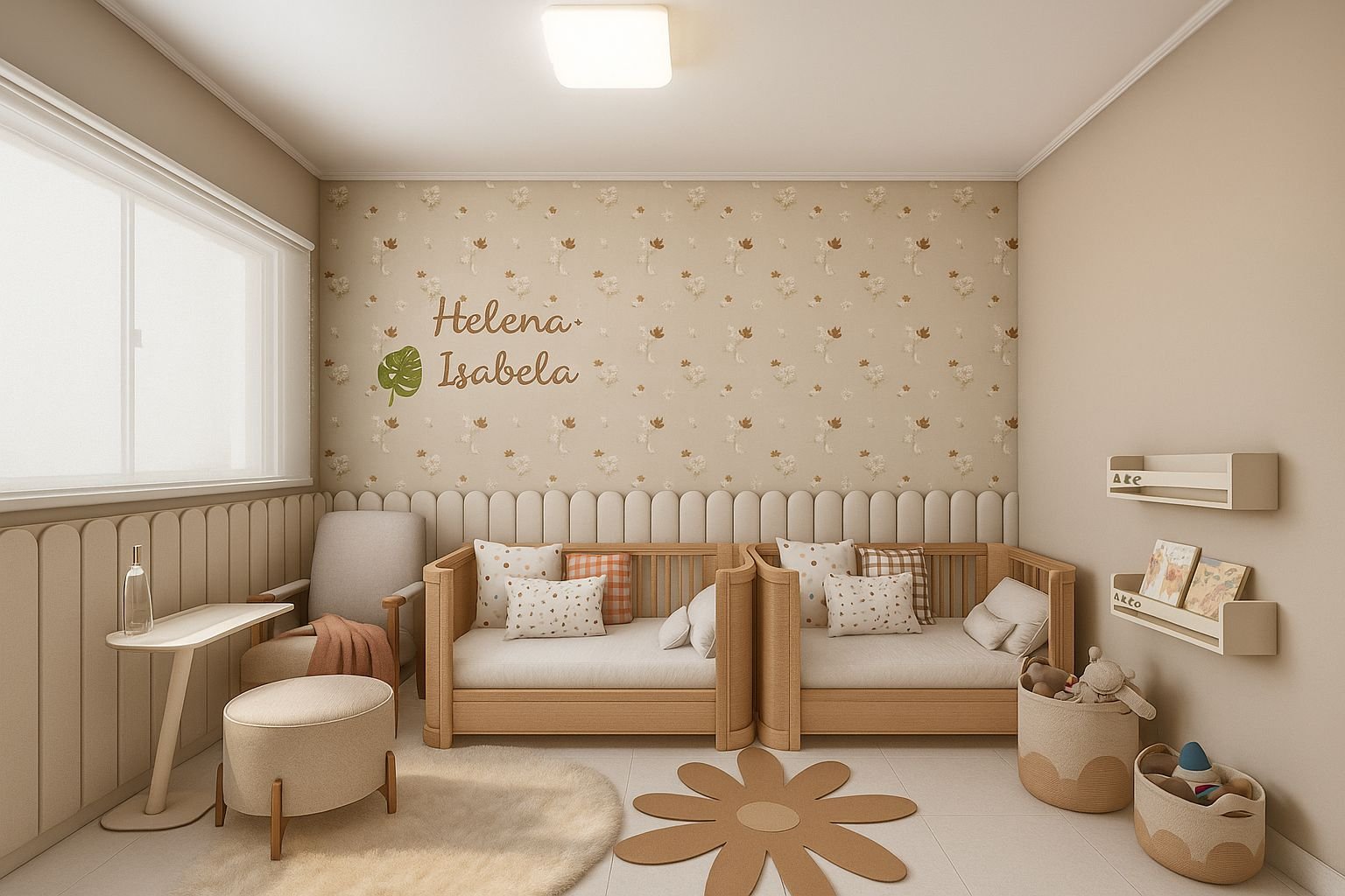 O resultado foi um quarto que une funcionalidade, aconchego e identidade compartilhada, permitindo que as gêmeas cresçam juntas em um espaço pensado especialmente para elas.