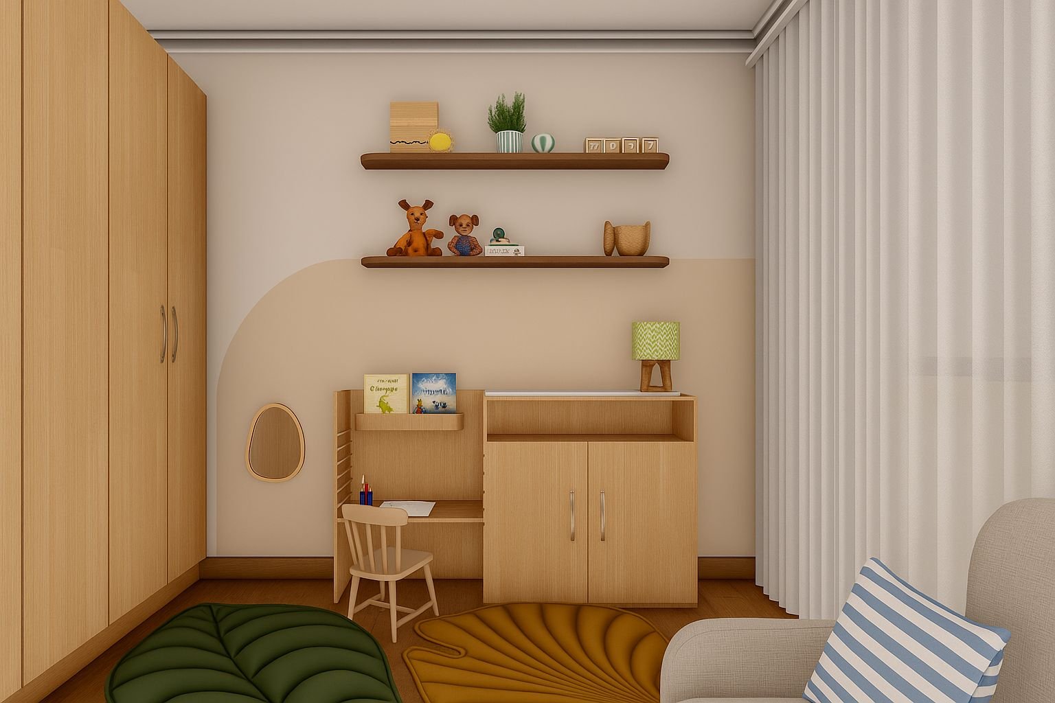 A proposta incluiu cores vibrantes e formas geométricas que remetem aos animais, transformando as paredes e detalhes decorativos em verdadeiras obras de arte. O mobiliário funcional e bem planejado garantiu organização e praticidade, sem comprometer a atmosfera lúdica do ambiente.